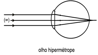 Um olho hipermétrope tem o problema oposto ao do míope, isto é, dificuldade para enxergar de perto, devido a um encurtamento do globo ou a um fraco poder de convergência do cristalino. O ponto próximo do hipermétrope se encontra a mais de 25 cm do globo.