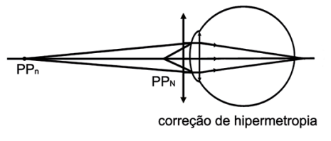 A imagem conjugada pelo cristalino se encontra após a retina e, dessa forma, devemos corrigir este defeito com uma lente convergente.