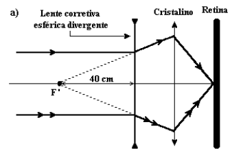 No olho míope, a imagem se forma antes da retina e, para que a imagem se conjugue normalmente, devemos utilizar uma lente divergente.