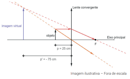 A lente convergente deve fazer a imagem de um objeto a 25 cm de distância (p = 25 cm) se formar a uma distância de 75 cm (p’ = – 75 cm; o sinal negativo indica que a imagem é virtual)
