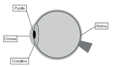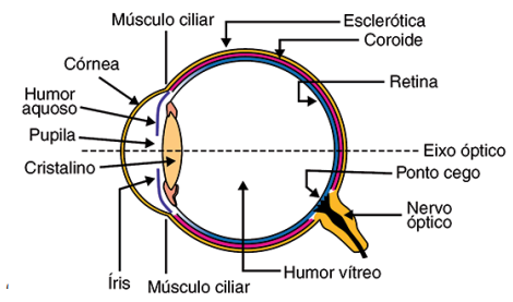A parte mais exterior é conhecida como córnea, que tem como função proteger o cristalino. A íris é a parte que representa a coloração característica dos olhos e a pupila é o orifício central (parte escura), responsável pelo controle da luminosidade que penetra no globo ocular. Atrás da pupila há o cristalino, que funciona como lente convergente para o olho humano. No fundo do olho fica a retina, que é onde a imagem é formada quando não há defeito visual. A retina possui um conjunto de nervos, denominado nervo óptico, que leva a mensagem de formação de imagens para o cérebro.
