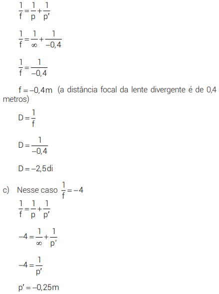 A lente divergente deve produzir uma imagem que se forma no ponto remoto do olho míope, portanto, p’ = – 0,4 m (o sinal negativo indica que a imagem é virtual) de um objeto que se encontra no infinito, portanto, p = ∞ .