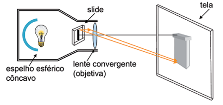 O projetor de slides é um instrumento de projeção e precisa de um anteparo, em geral uma tela, para que a imagem possa ser vista. Além da imagem ser real, ela é maior e invertida.