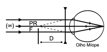 01. (UNICAMP – MODIFICADA) Nos olhos das pessoas míopes, um objeto localizado muito longe, isto é, no infinito, é focalizado antes da retina. À medida que o objeto se aproxima, o ponto de focalização se afasta até cair sobre a retina. A partir deste ponto, o míope enxerga bem. A dioptria D, ou “grau”, de uma lente é definida como D = 1/(distância focal) e 1 grau = 1 m-1. Considere uma pessoa míope que só enxerga bem objetos mais próximos do que 0,4 m de seus olhos.