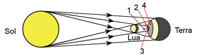 • Região 4 = penumbra projetada. Nessa região ocorre o eclipse parcial do Sol, caso em que uma parte do “disco solar” permanece visível.