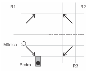 Pedro observa três imagens da Mônica, através dos espelhos, nas regiões R1, R2 e R3. O sentido do movimento de Mônica observado por Pedro na região R2 é representado pela seta: