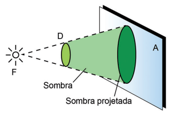 Entre o disco e o anteparo, observa-se uma área que não é iluminada pela fonte F e, considerando esta como a única fonte luminosa, esta região não iluminada consistirá em uma sombra. No anteparo, como está na figura, ocorre uma região denominada de sombra projetada.